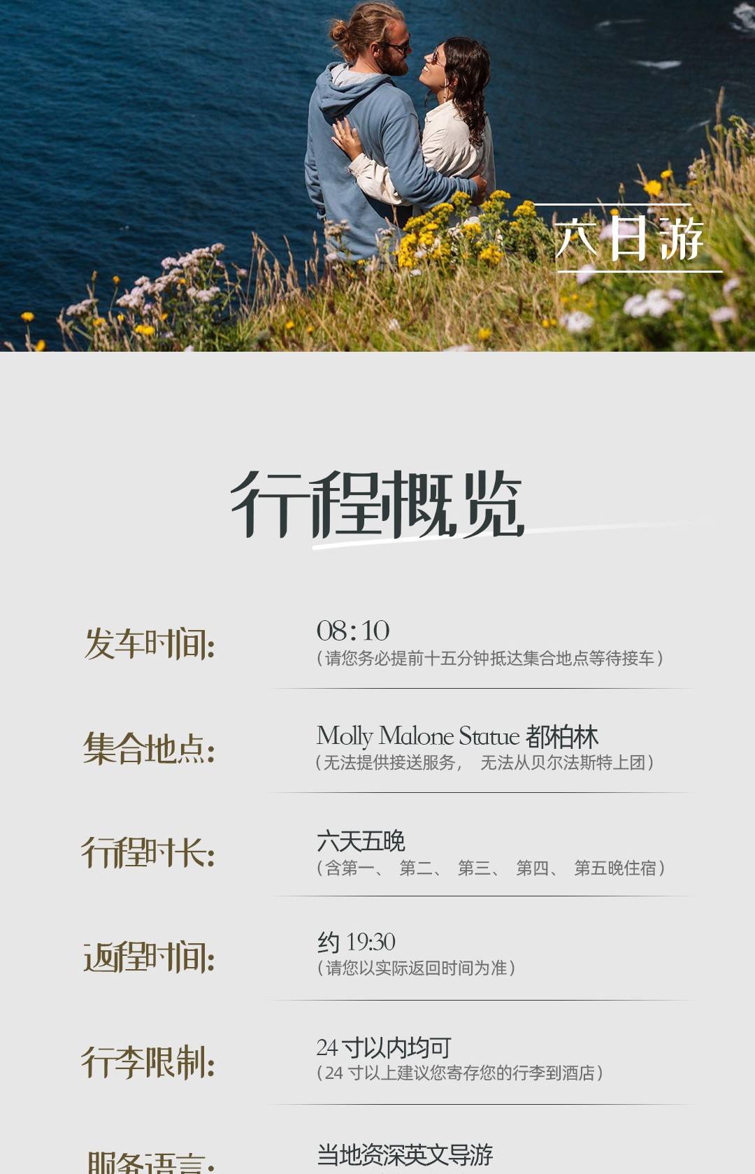 9、我们提供的行程大部分是当地参团英文导游,如未明确标注中文导游,均为当地英文导游,我们无法因为您没有看清给您免费取消行程,请悉知。