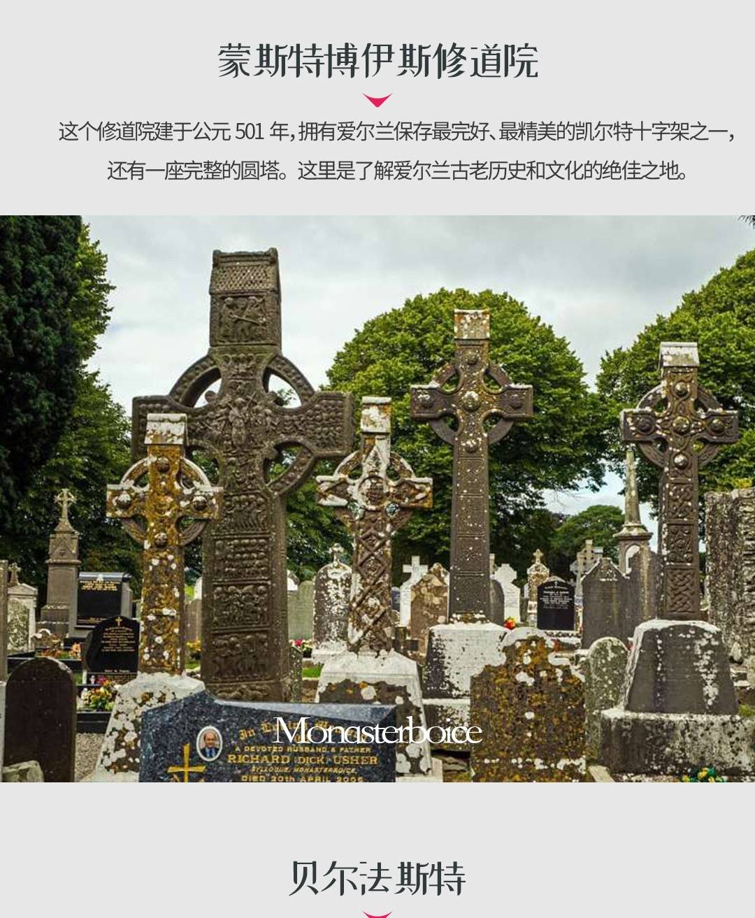 从都柏林出发,我们的第一站是Monasterboice,这是一个可以追溯到公元501年的修道院遗址。这个古老的修道院是爱尔兰保存最好、最精美的凯尔特十字架的所在地,它还拥有一个完整无损的圆塔。探索为什么Lonely Planet将贝尔法斯特评为地球上十大“必看”目的地之一。首先,我们参观贝尔法斯特的头号景点——泰坦尼克体验馆(门票已包含)!我们将带您回到过去,体验泰坦尼克号的故事。从20世纪初在贝尔法斯特的构想,到它的建造和下水,再到它臭名昭著的首航和灾难性的结局。我们还强烈推荐世界著名的黑色出租车游(20欧元/15英镑),参观和平墙和政治壁画。您的司机将向您展示城市的亮点,包括市政厅、女王大学、阿尔伯特钟、植物园等等。在贝尔法斯特过夜。
