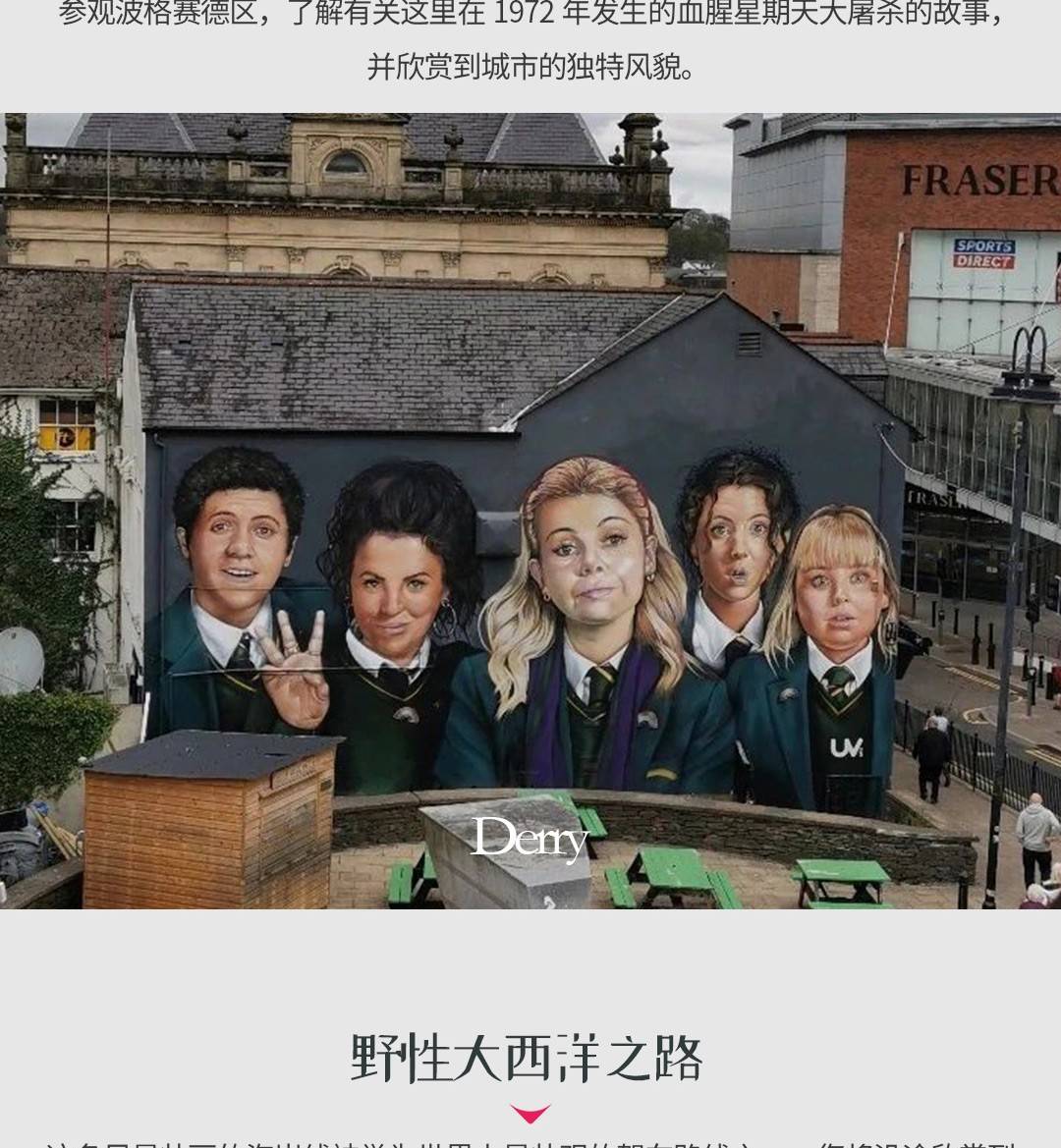 下午我们将参观Dunluce Castle的废墟(从4月1日开始白天较长,我们包括了门票并在此停留约一小时)。一天结束时我们将在德里。了解为什么这座城市正式被称为Londonderry,以及1689年长达血腥围城的故事。您的导游将带您前往著名的Bogside区,1972年“血腥星期天”大屠杀的现场,也是U2经典歌曲《Sunday, Bloody Sunday》的灵感来源。