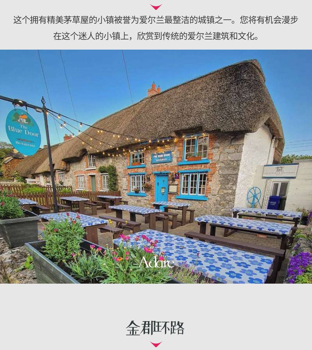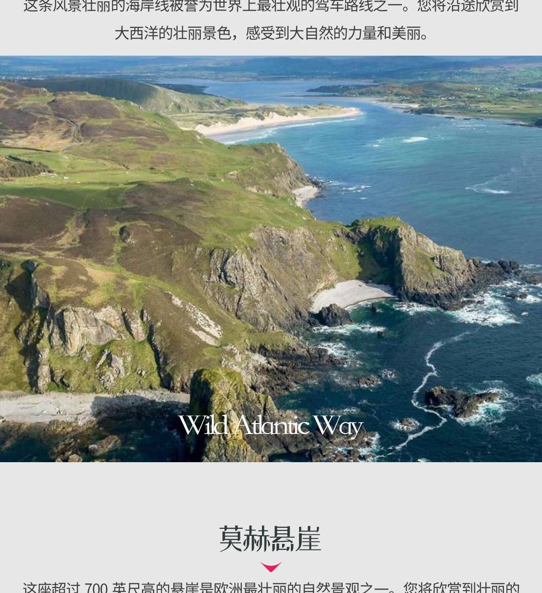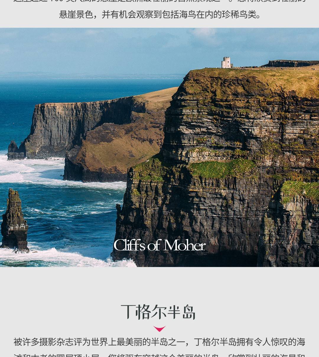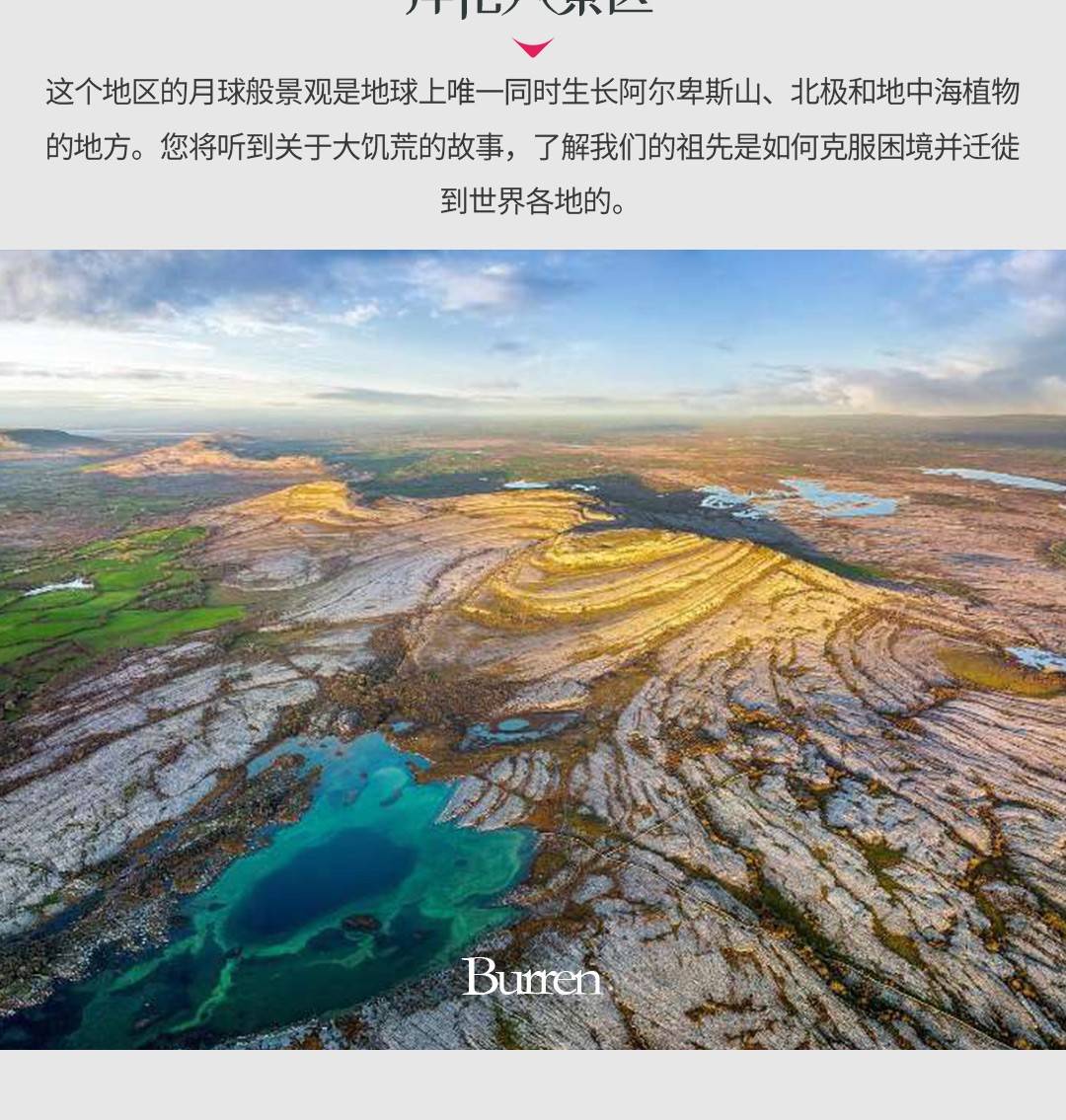 今天,当我们沿着西海岸巡航时,您将拥有野性大西洋作为您的旁边。看到美丽的海滩、金色的沙滩,甚至可能看到一些海豚和鲸鱼。在Burren的月球般的景观中奔跑,这是地球上唯一一个阿尔卑斯、北极和地中海花卉并存的地方,听您的导游讲述我们的祖先是如何克服1845-49年的大饥荒的恐怖,将我们的超过一百万的祖先送往全球各地,尤其是英国、北美和澳大利亚。我们将在Doolin村停留午餐,也许还能喝上一品脱啤酒,之后继续前往附近的莫赫悬崖。莫赫悬崖高达700英尺,可能是欧洲最壮观的悬崖,是一些大自然最雄伟的鸟类包括海鹦鹉和塘鹅的家园。之后,我们将穿过历史悠久的利默里克的香农河。今天的最后一站是美丽的遗产小镇Adare,以其精美的茅草屋而闻名,被频繁评为爱尔兰最整洁的镇。我们将在风景如画的丁格尔半岛过夜。