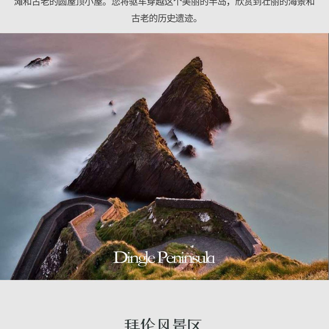 今天我们将开始举世闻名的丁格尔半岛之旅。我们访问爱尔兰最长的海滩Inch,然后短途驾车前往丁格尔,一个迷人的讲盖尔语的渔村。丁格尔以其多部电影如《天涯海角》和《莱恩的女儿》的拍摄地而闻名,以及该镇尺寸之大拥有的酒吧数量而著称,52个酒吧和2000人口。我们当然不会忘记丁格尔最著名的居民,Fungi the Dolphin,我们将在下午早些时候有时间拜访。接着,我们将开启一段美妙的旅程,环绕Slea Head驾驶,欣赏到Sleeping Giant Island、Blasket Islands和公元前2000年的Beehive Huts的惊人景观。许多摄影杂志认为,Slea Head是世界上最美丽的半岛之一,它拥有爱尔兰一些最美丽的海滩,绝对是著名的野性大西洋之路的亮点。这个区域完全是讲盖尔语的,您甚至可能有机会听到当地人用这种古老的语言交流。然后,我们回到丁格尔,在那里有充足的时间在传统的艺术和手工艺品商店购物,并在许多色彩缤纷的酒吧中的某一个享用一些小食,同时聆听当地音乐人演奏一些神秘的旋律。今晚我们将留宿在凯里郡的首府基拉尼。在这里,我们将与当地人混在一起,享受一个真正的爱尔兰郡城镇的特色,远离大城市的喧嚣和繁忙。可以选择在火炉旁拉上一张凳子,或在附近的国家公园享受一次放松的晚餐后散步。