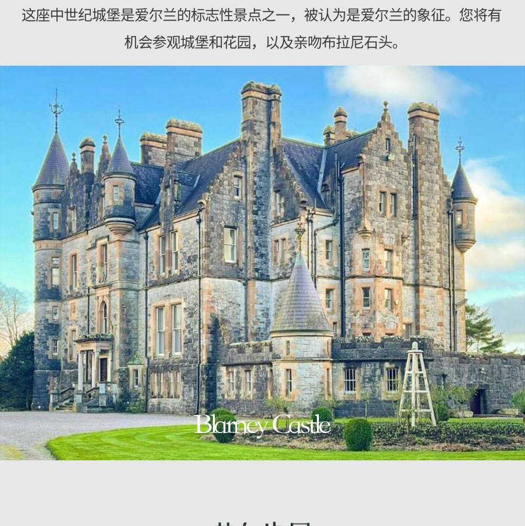 这一天从一次可选的马车游览基拉尼国家公园开始,或者对于那些精力充沛和爱冒险的人来说,可以选择骑马游览公园。之后,我们将重新集合,穿越科克和凯里山区,前往世界闻名的布拉尼城堡。您将有充足的时间(2小时)参观城堡,在那里您可以选择亲吻布拉尼石(据说这样可以获得雄辩的口才,也称为能言善辩的天赋)。美丽的花园提供了一个放松身心的机会,而那些寻找最后一刻纪念品的人可以探索优秀的布拉尼羊毛磨坊,这是世界上最大的爱尔兰商店。午餐后,我们将通过爱尔兰最优质的农业土地,黄金山谷地区,这里是世界上一些最好的牲畜的家园。在我们到达都柏林之前,我们将在俯瞰伦斯特省的高山上的邓马斯石堡(Rock of Dunamase)暂停——等待您的是惊人的照片机会和视野。下午晚些时候回到都柏林,正好赶上晚餐预约和晚间娱乐活动。